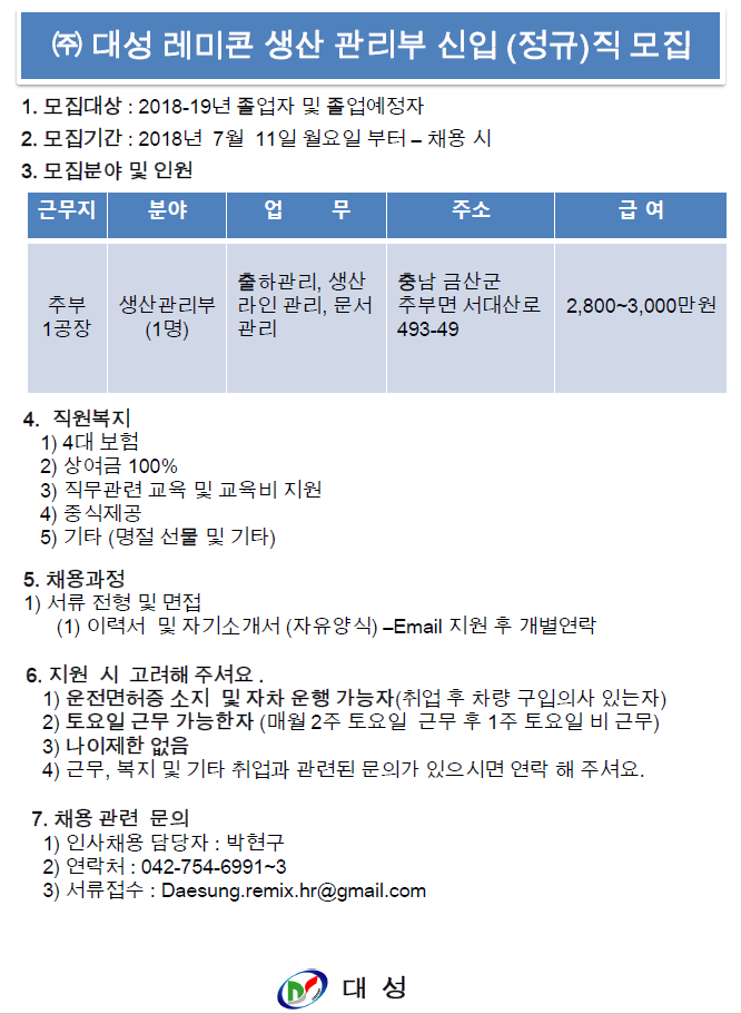 | 제목 | (주) 대성레미콘 생산관리부 신입(정규)직 모집 | ||||