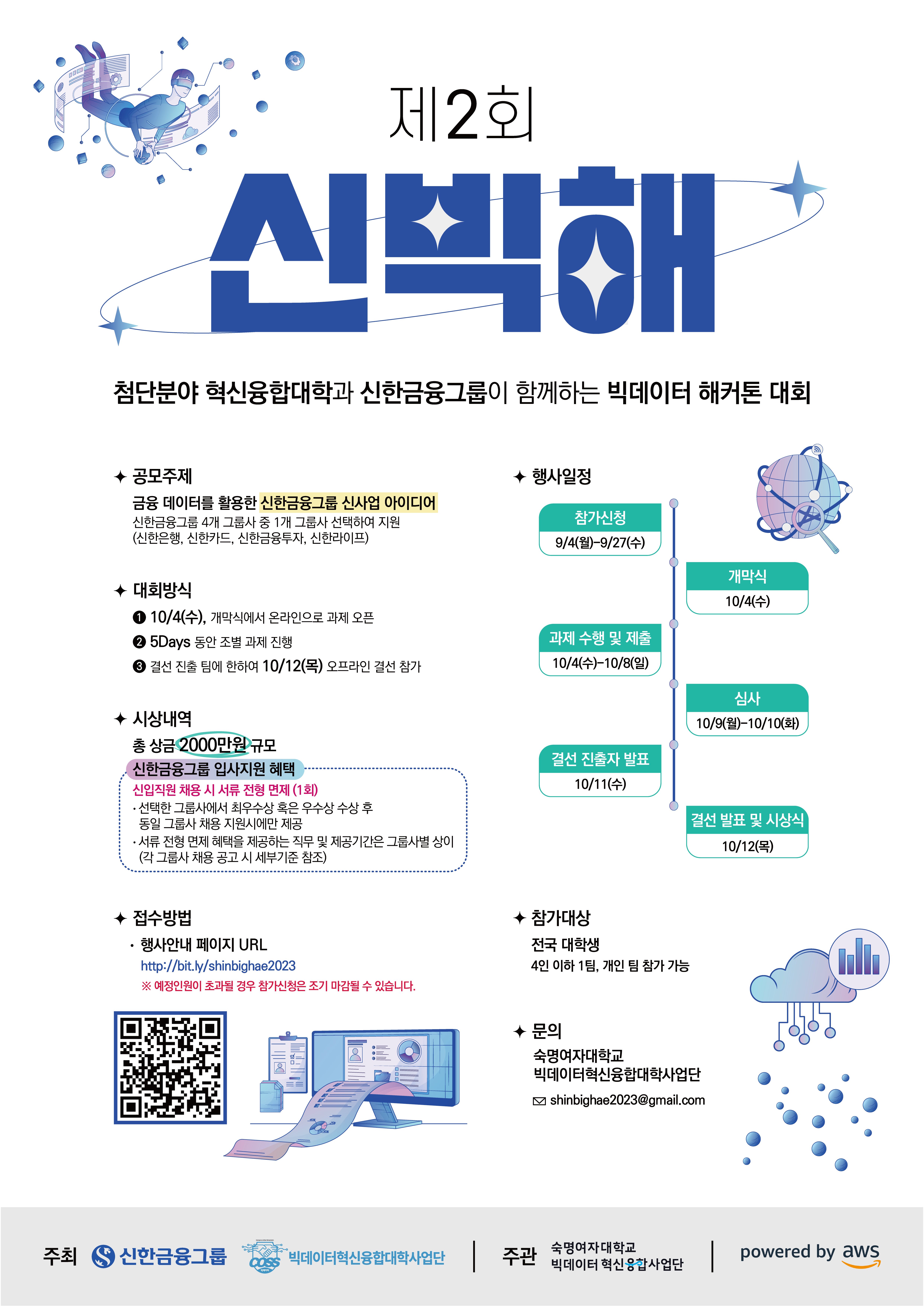 | 제목 | 첨단분야 혁신융합대학과 신한금융그룹이 함께하는 빅데이터 해커톤 대회 안내 | ||||