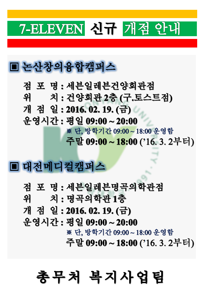 | 제목 | 대전/논산 캠퍼스 세븐일레븐 개점 안내 | ||||