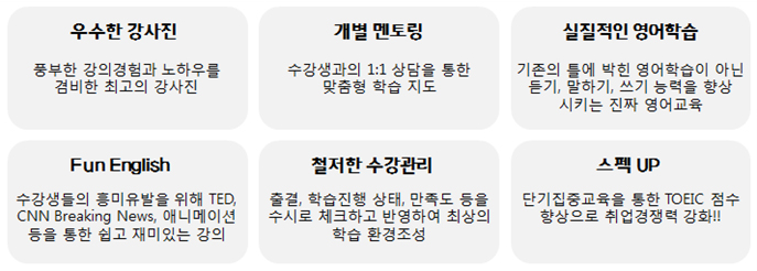 향상시키고 나아가 취업 필수 스펙인 TOEIC 및 TOEIC Speaking 점수를 향상시킴으로서 취업경쟁력을