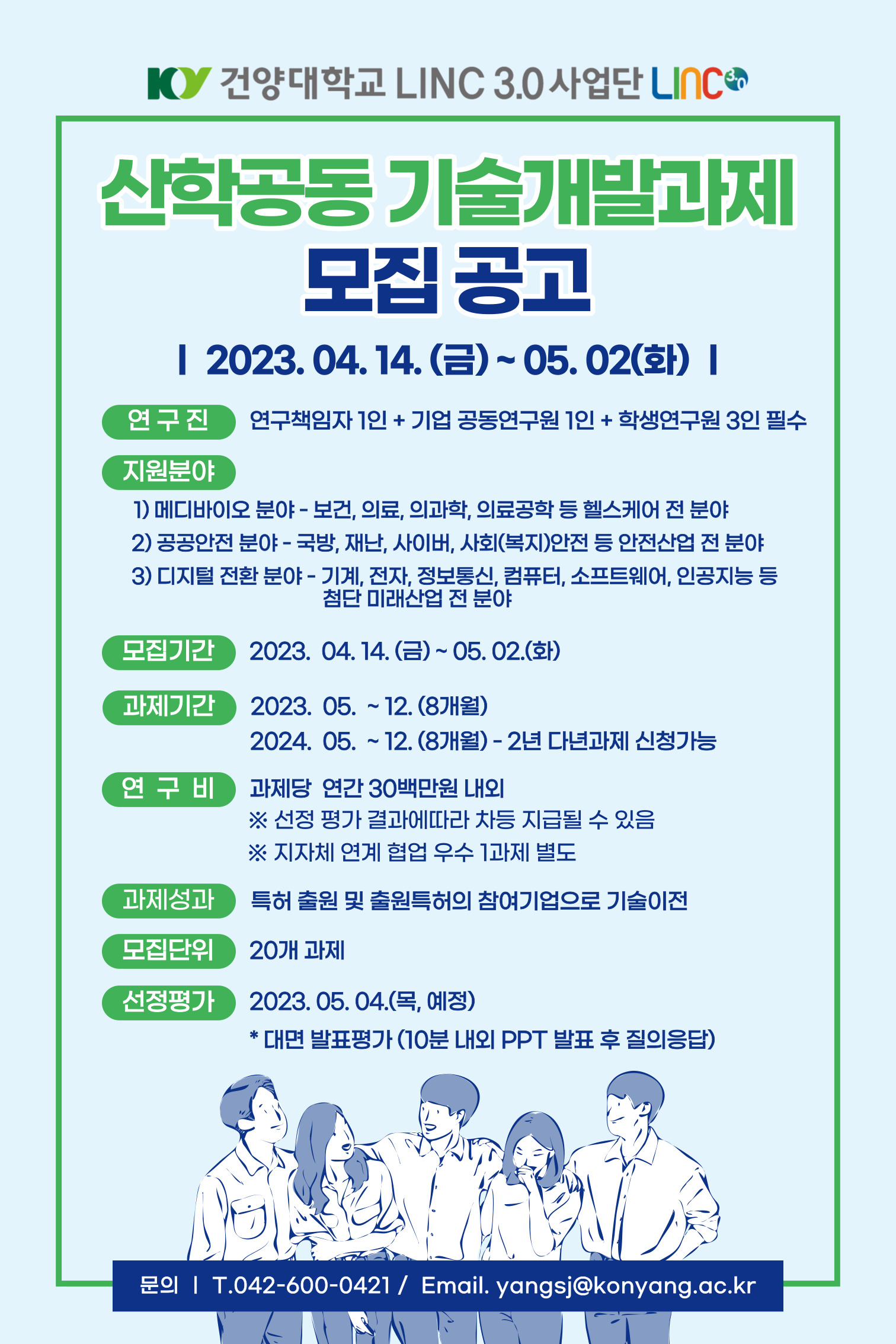 - 신청기간 : 2023. 4. 14.(금)~5. 2.(화) - 제출처 : linc3@konyang.ac.kr(첨부서식 이메일 제출) - 문의처 : LINC 3.0 사업단 기업지원실(042-600-0421) * 자세한 내용은 첨부파일을 참고하여 주시기 바랍니다.