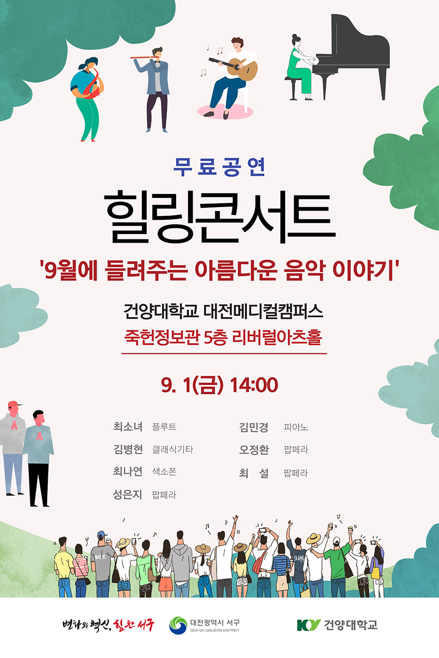 건양대학교는 대전 서구와 협력하여 Living Health Campus 사업을 운영하고 있습니다. 지역주민 및 건양교육재단 가족을 위하여 아래와 같이 콘서트를 진행하고자 합니다. 힐링콘서트와 함께 행복한 시간 되시기 바랍니다.