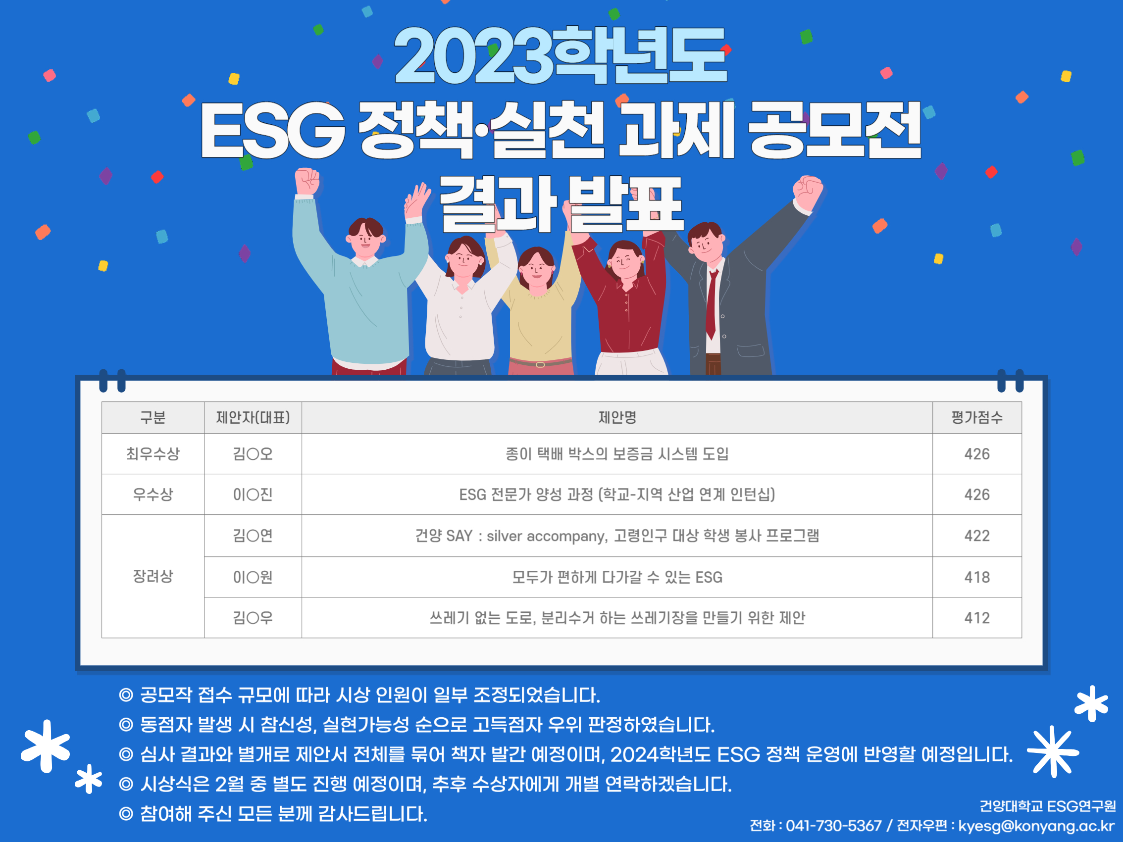 | 제목 | 2023학년도 ESG 정책·실천 과제 공모전 심사 결과 안내 | ||||