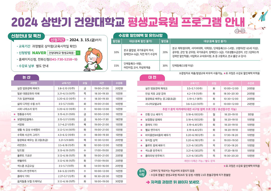| 제목 | 2024년 상반기 건양대 평생교육원 프로그램 안내 | ||||