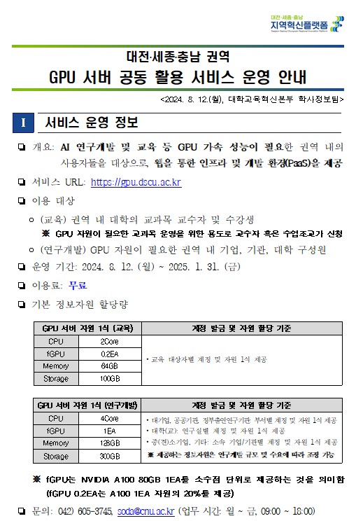 | 제목 | 대전·세종·충남 권역 GPU 컴퓨팅 서버 공동 활용 서비스 운영 안내 | ||||