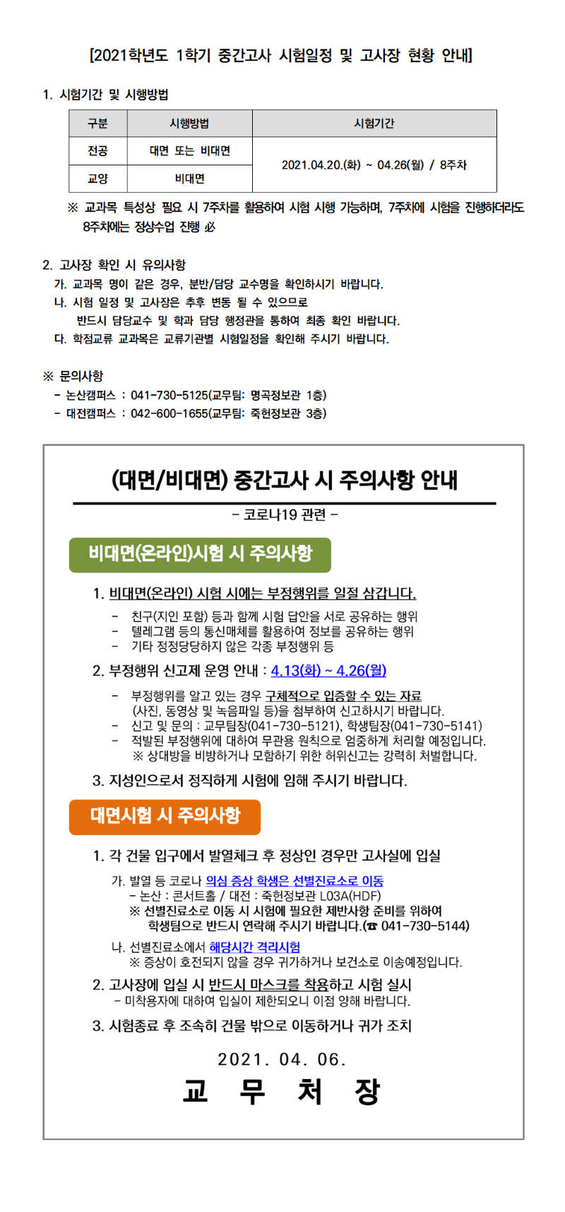 | 제목 | 2021학년도 1학기 중간고사 시험 일정 안내 | ||||