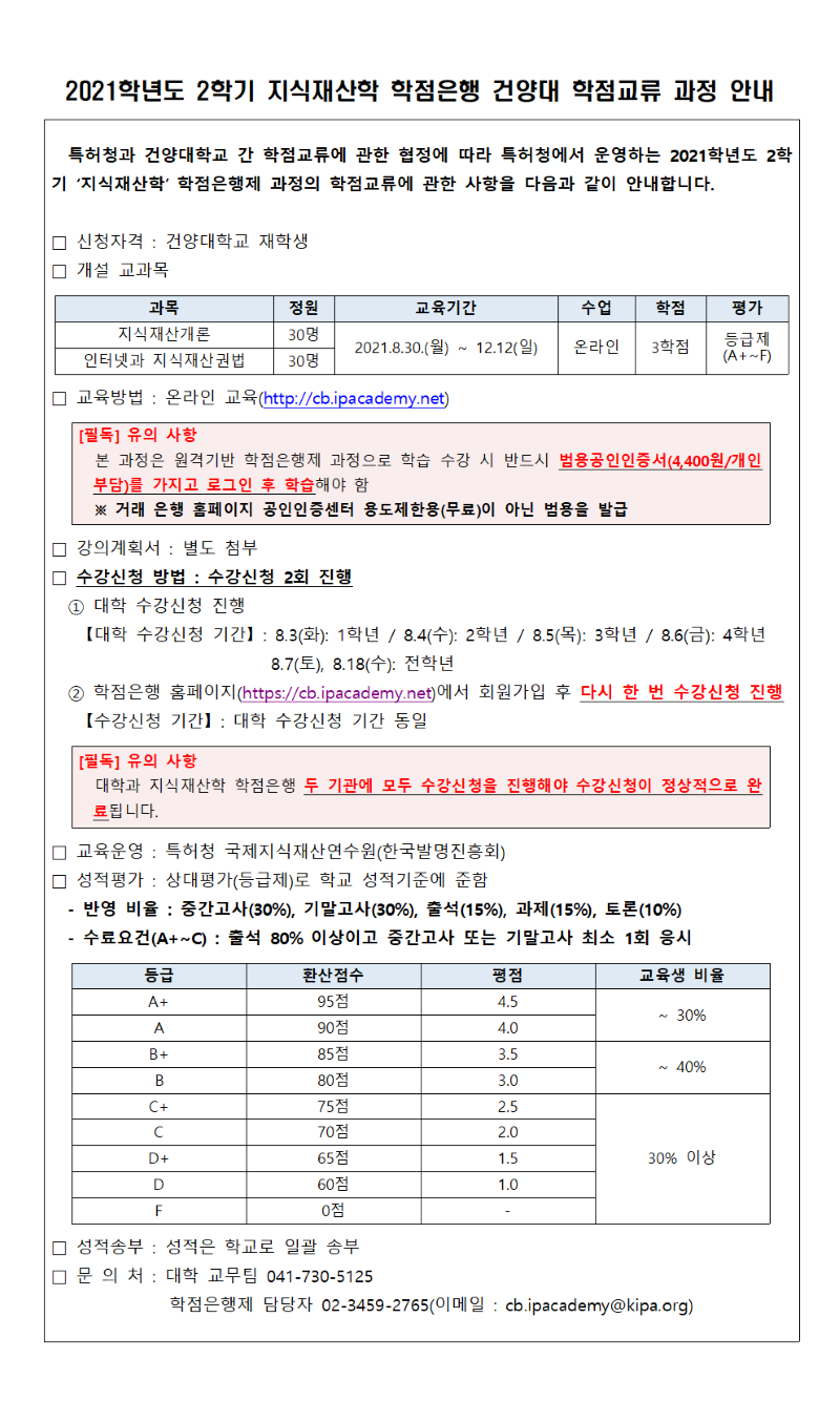 | 제목 | [학점교류] 2021학년도 2학기 지식재산학 학점교류 과정 안내 | ||||