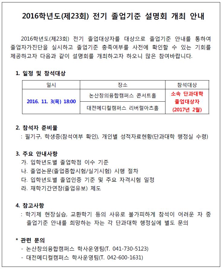 | 제목 | 2016학년도(제23회) 전기 졸업기준 설명회 개최 안내 | ||||