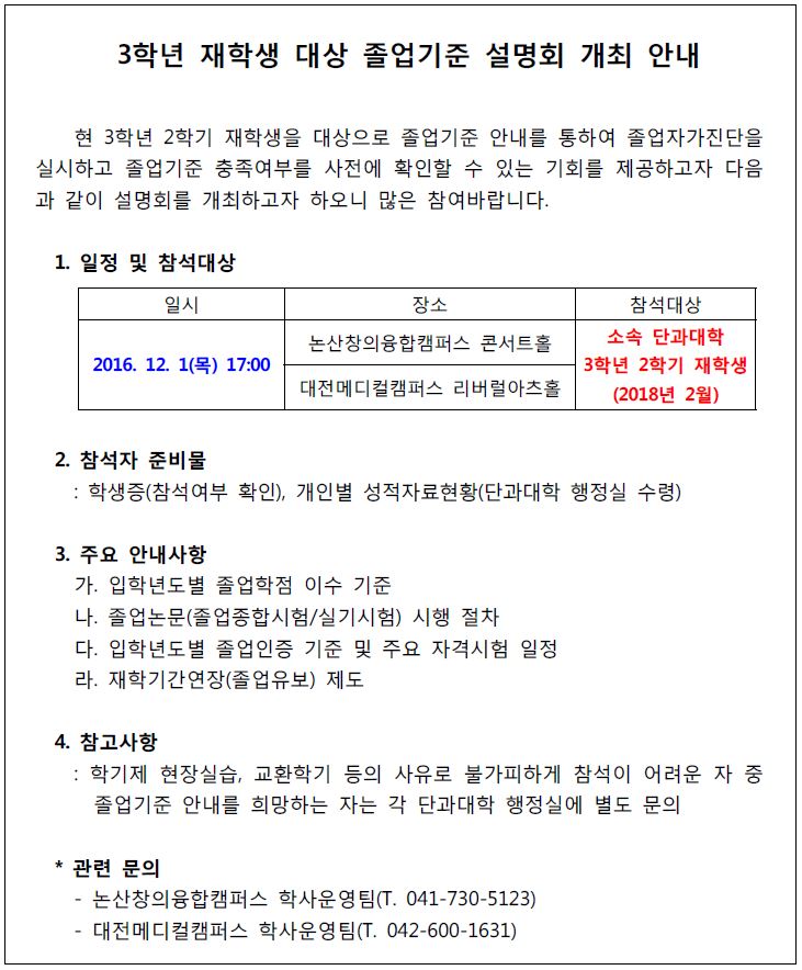| 제목 | 3학년 재학생 대상 졸업기준 설명회 개최 안내 | ||||