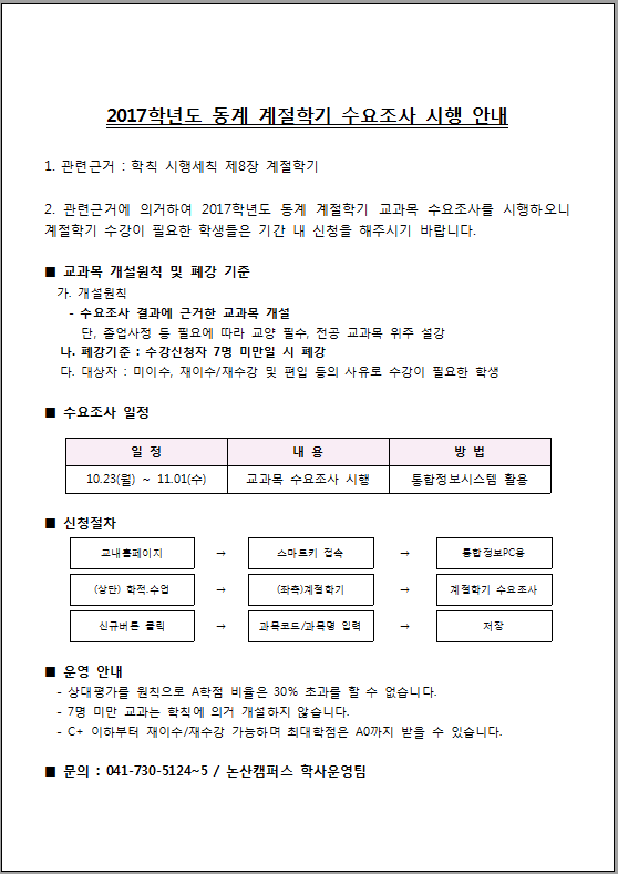 | 제목 | 2017학년도 동계 계절학기 수요조사 시행 안내 및 질의응답(Q&A) | ||||