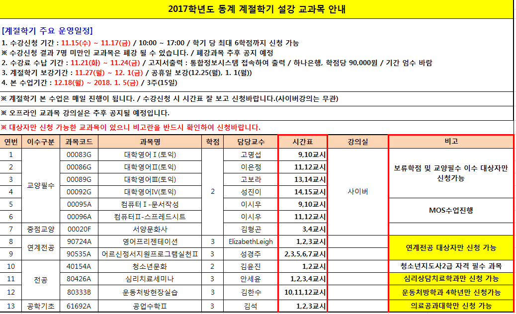 | 제목 | 2017학년도 동계 계절학기 설강 교과목 및 주요 일정 안내 | ||||