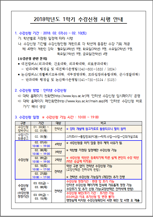| 제목 | 2018학년도 1학기 수강신청 시행 안내 | ||||