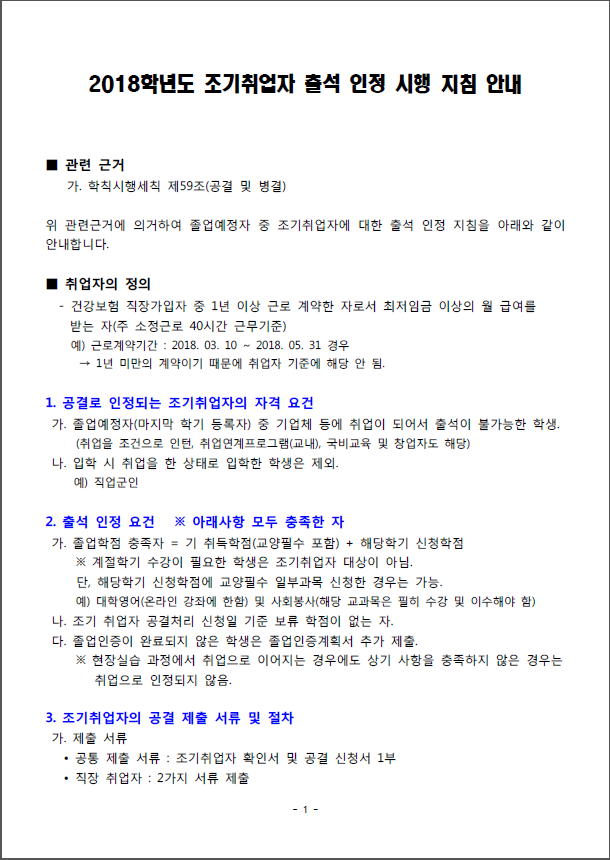 | 제목 | 2018학년도 졸업예정자 중 조기취업자의 출석 인정 시행 지침 안내 | ||||