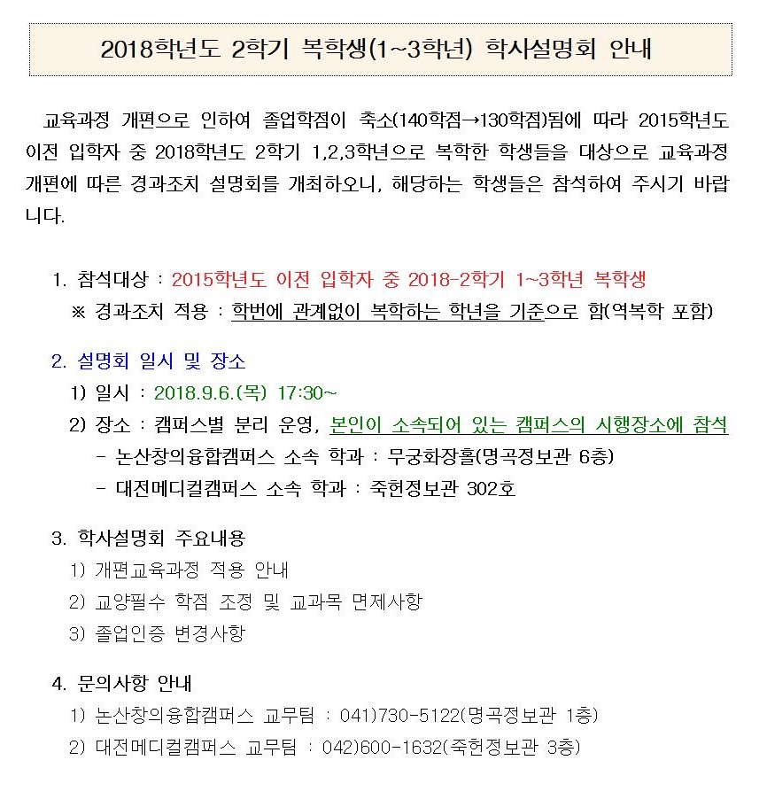 | 제목 | 2018학년도 2학기 복학생(1~3학년) 학사설명회 안내 | ||||
