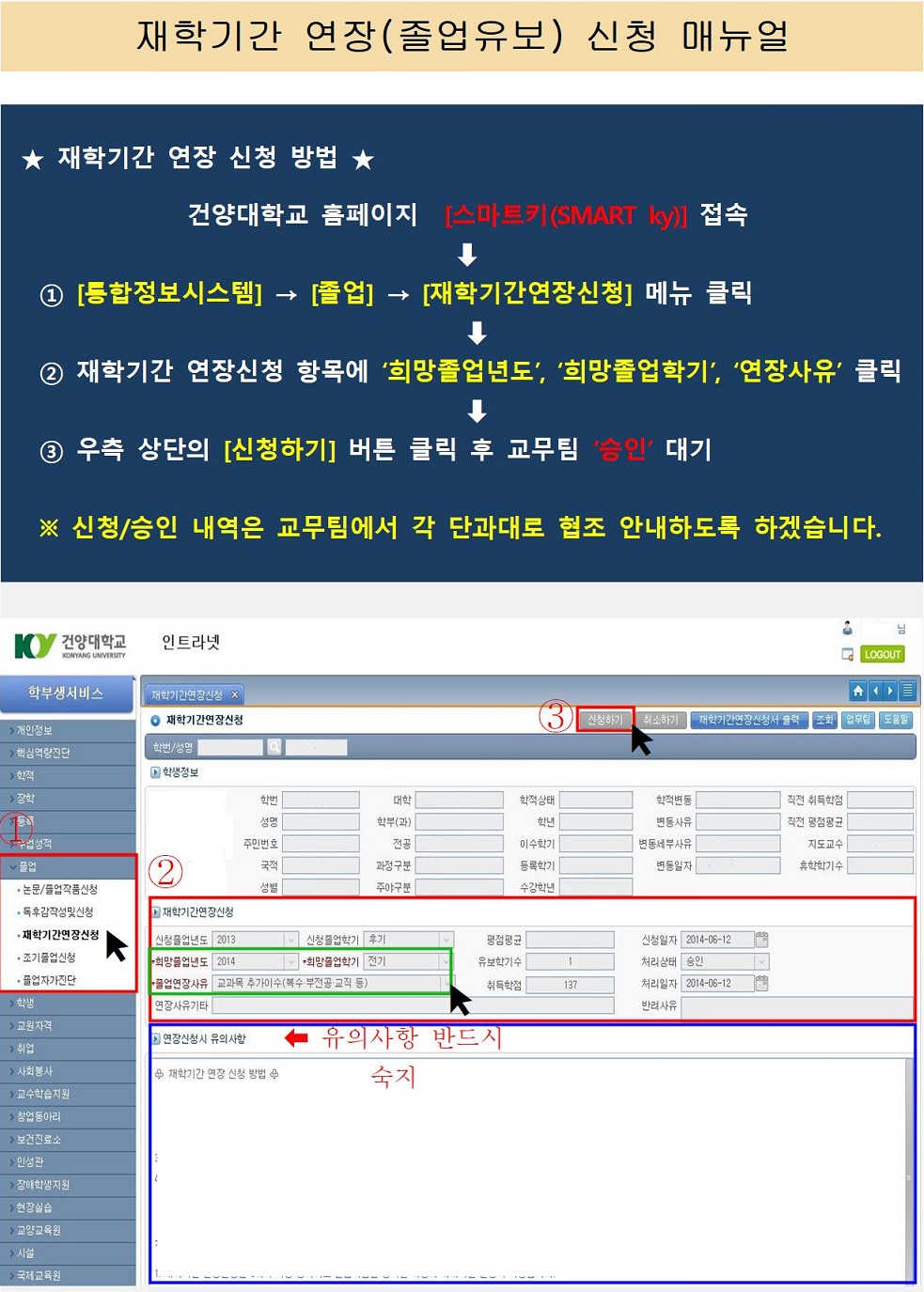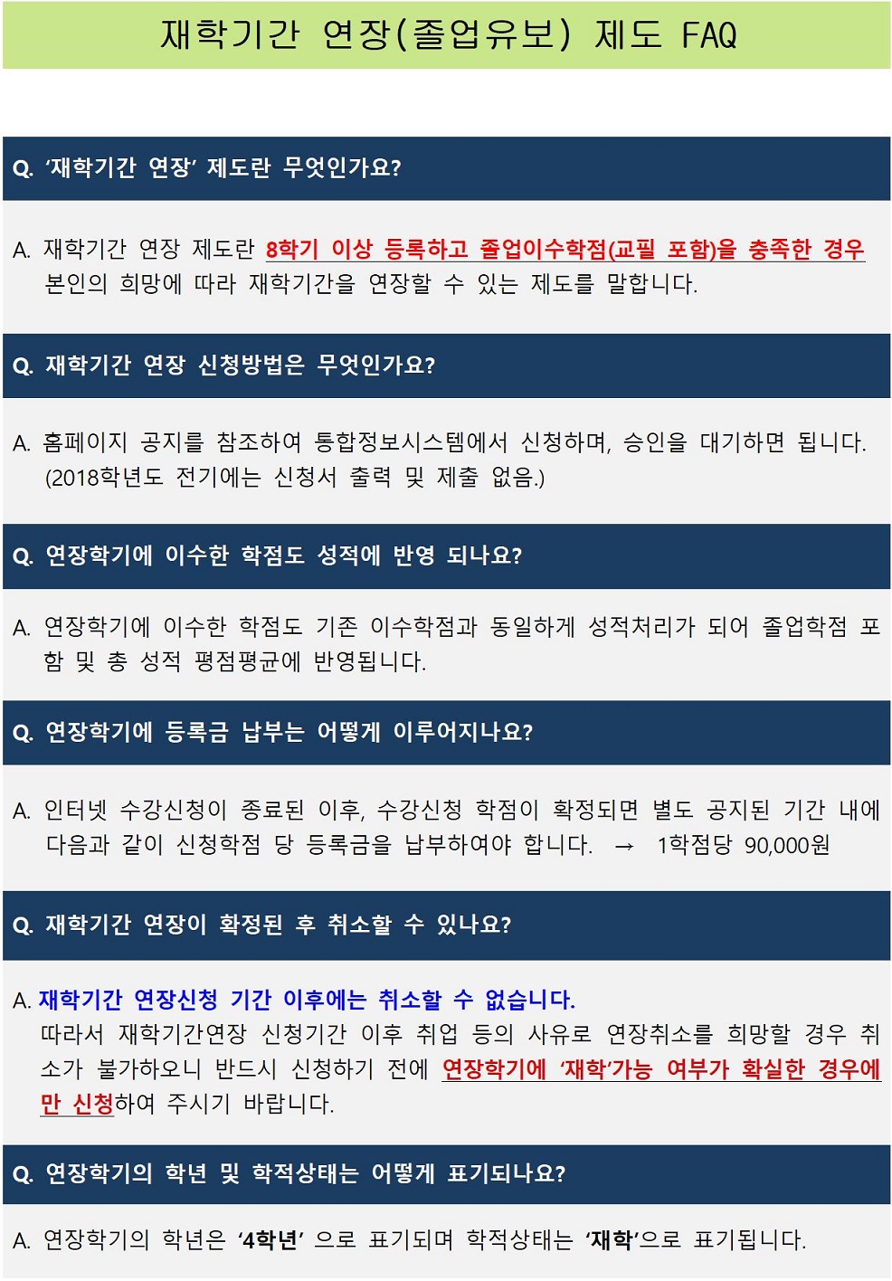 ※ 2019학년도1학기 부터는 재학기간 연장 신청 제도가 많이 바뀝니다. 향후 추가 신청이 필요한 학생은 다음학기 공지사항을 잘 보시기 바랍니다.