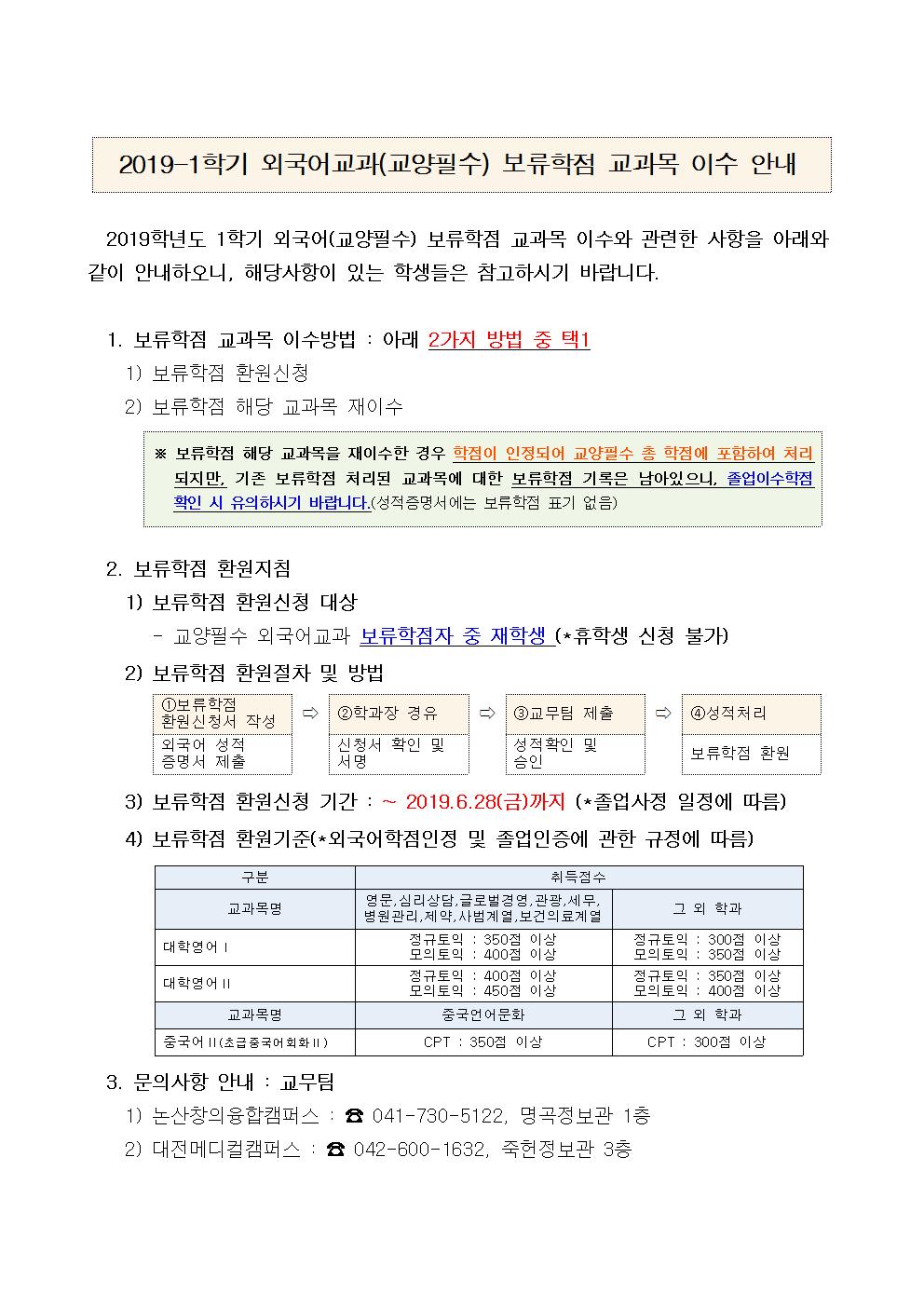 | 제목 | 2019학년도 1학기 외국어교과(교양필수) 보류학점 교과목 이수 안내 | ||||
