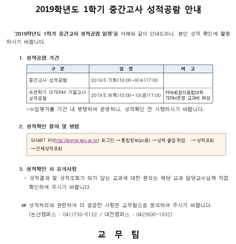 | 제목 | 2019학년도 1학기 중간고사 성적공람 안내 | ||||