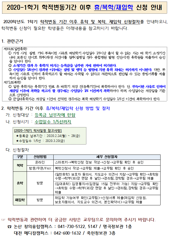 | 제목 | 2020-1학기 학적변동기간 이후 휴/복학/재입학 신청 안내 | ||||