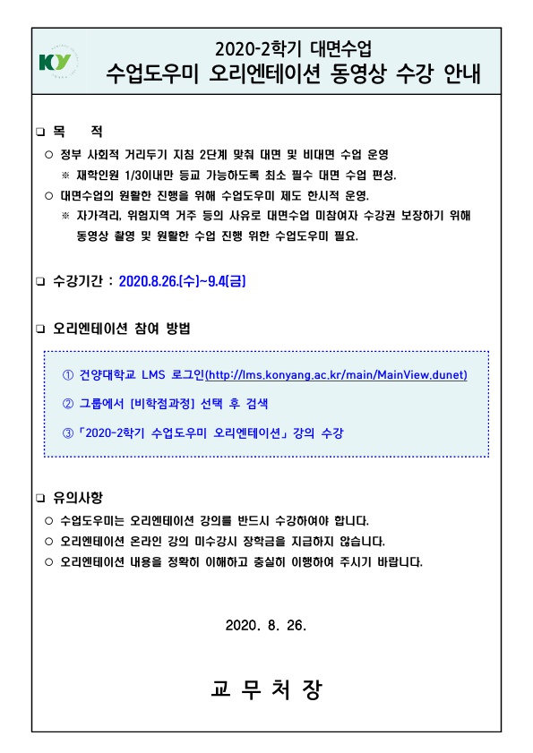 | 제목 | 2020-2학기 대면수업 수업도우미 오리엔테이션 수강 안내 | ||||