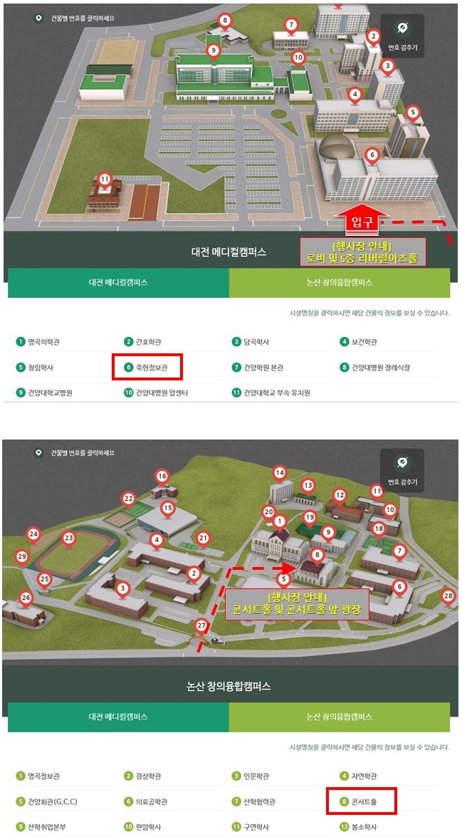 ☏ 문의 : 교무팀(논산 041-730-5122, 5130 / 대전 042-600-1632) ❍ 캠퍼스별 행사장 안내