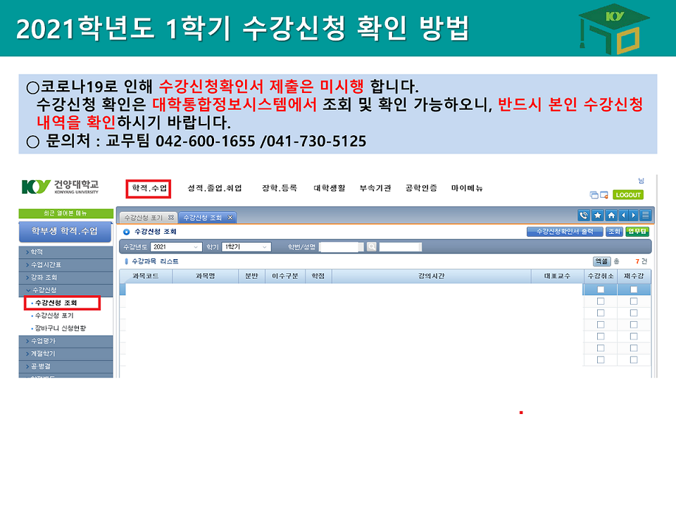 2021학년도 1학기 수강신청 포기 및 수강신청 최종 확인 방법을 아래와 같이 안내드립니다. ○ 수강신청포기 방법 변경 :이메일 제출→ 대학통합정보시스템에서 수강신청 포기 신청 ※ 교무팀에서 승인과정이 있어 다음날 수강신청 확인이 가능합니다. ※ 수강포기 시 졸업학점에 영향이 없는지 장학금 수혜에 문제가 없는지 등등 학사 전반에 대하여 반드시 확인하신 후에 진행하시기 바랍니다.