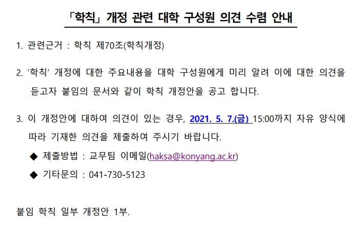 | 제목 | 학칙 개정(안) 대학 구성원 의견 수렴 안내(6) | ||||