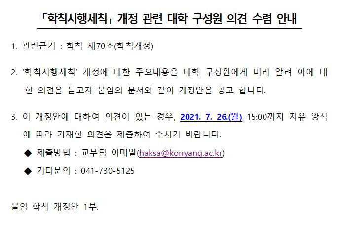 | 제목 | 학칙시행세칙 개정 관련 구성원 의견 수렴 안내 | ||||