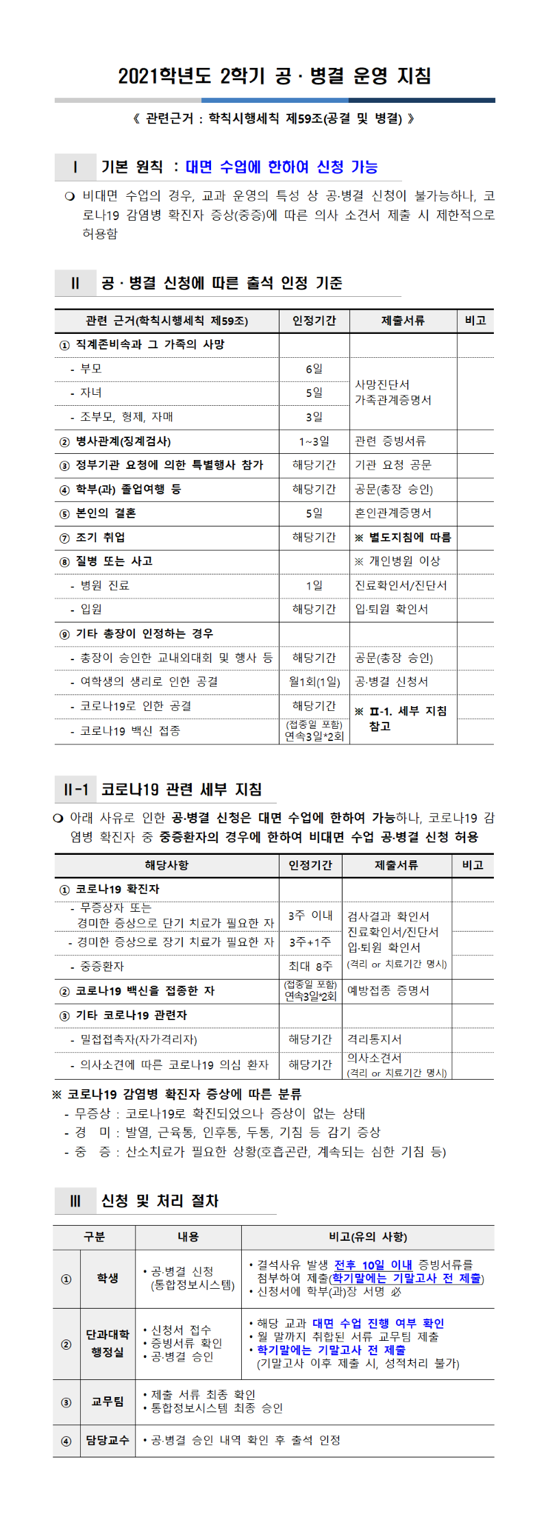 | 제목 | 2021학년도 2학기 공·병결 운영 지침 안내 | ||||