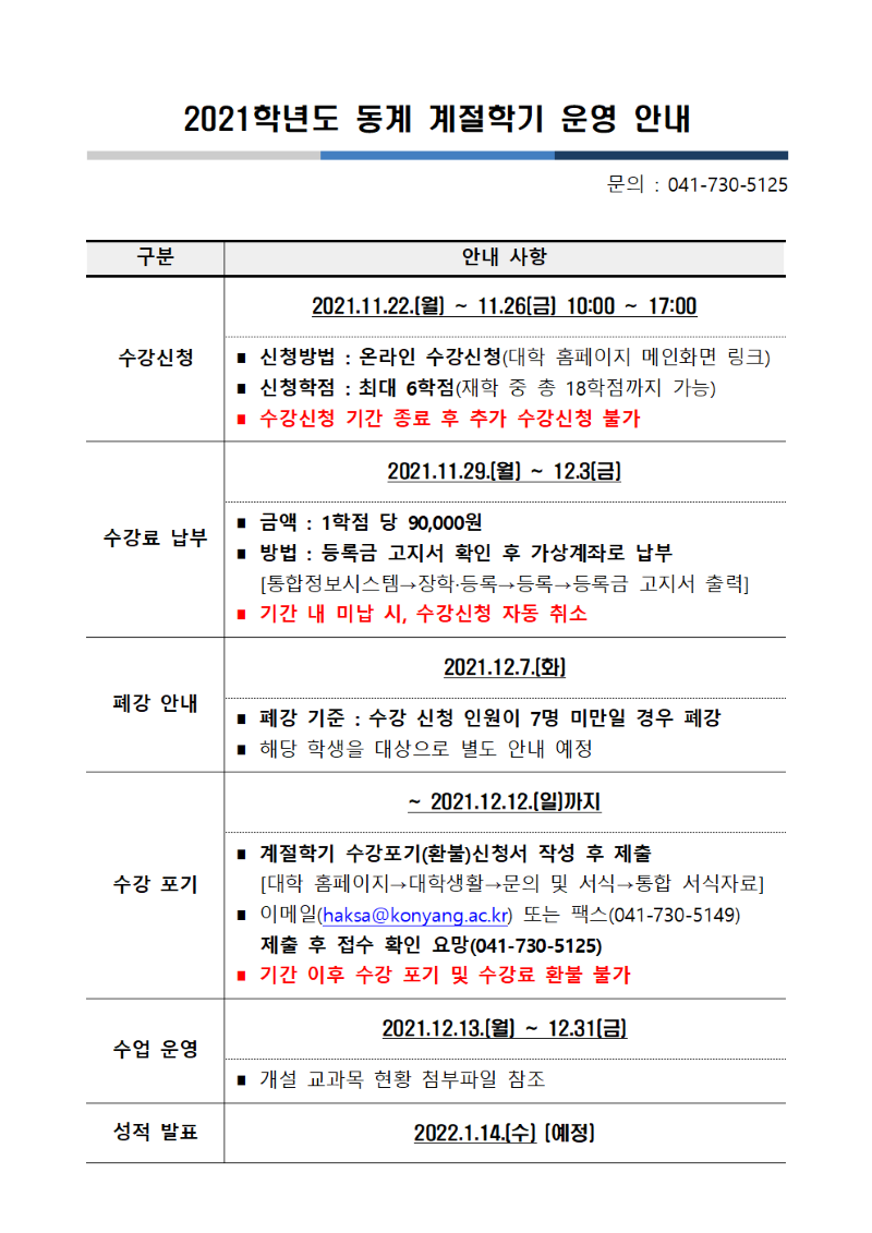 | 제목 | 2021학년도 동계 계절학기 운영 안내 | ||||