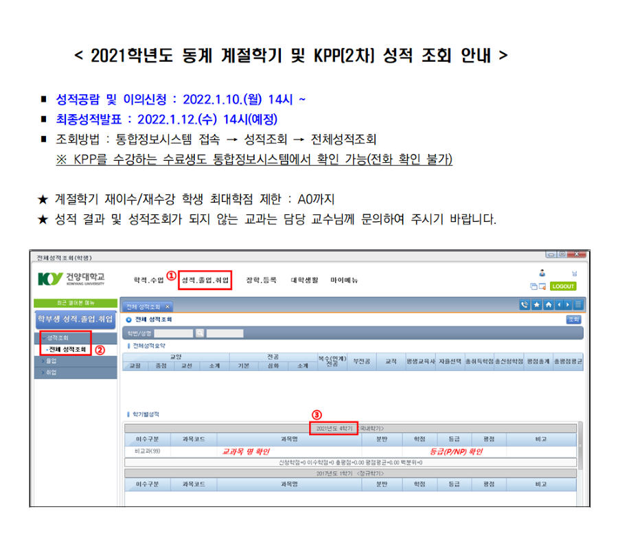 | 제목 | 2021학년도 동계 계절학기 및 KPP(2차) 성적 조회 안내 | ||||