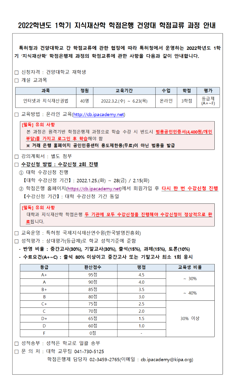 | 제목 | [학점교류] 2022학년도 1학기 지식재산학 학점교류 과정 안내 | ||||