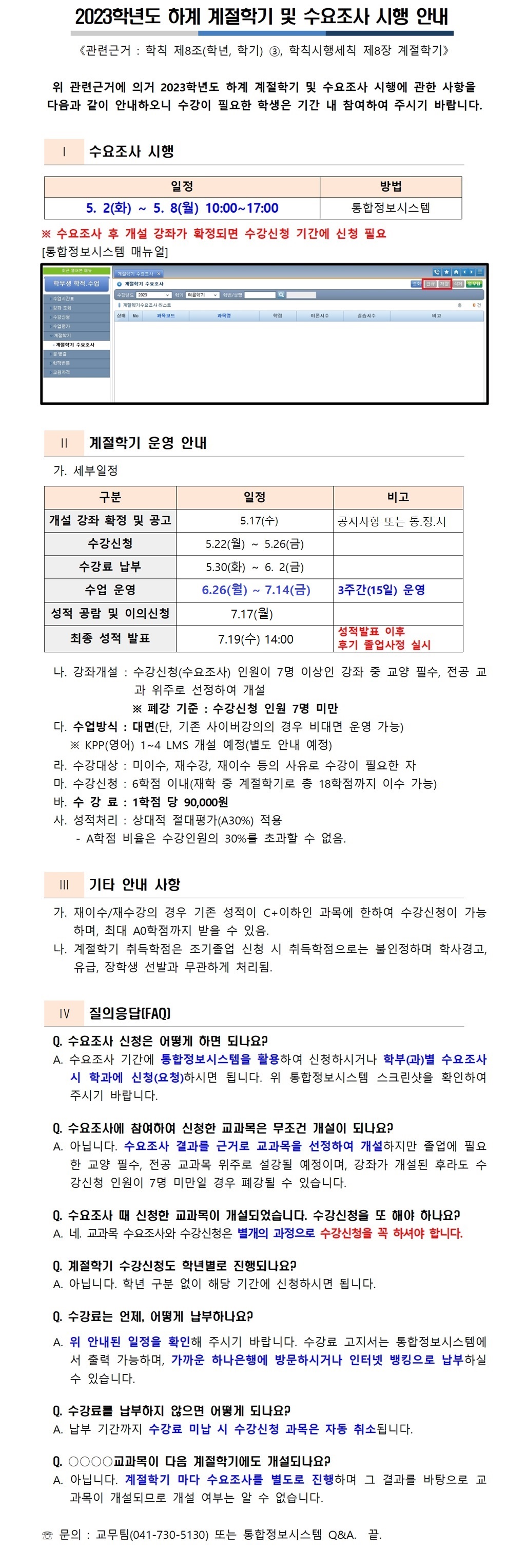 계절학기 수강료 교무팀 하계 수요조사 KPP 2023 통합정보 환불 수강신청 2023학년도 하계 계절학기 및 수요조사 시행 안내