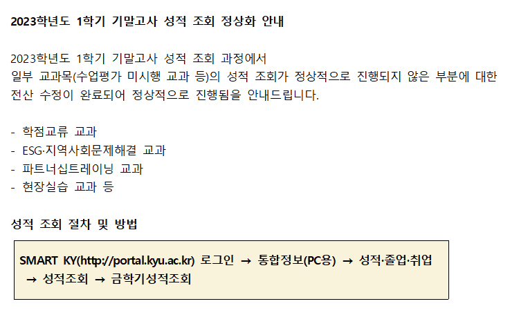 | 제목 | 2023학년도 1학기 기말고사 성적 조회 정상화 안내 | ||||