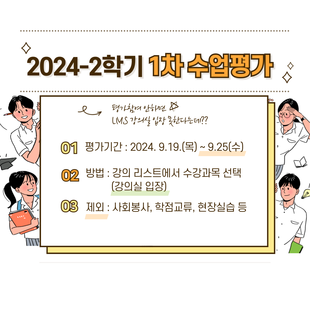 | 제목 | 2024-2학기 1차 수업평가 시행 안내 | ||||