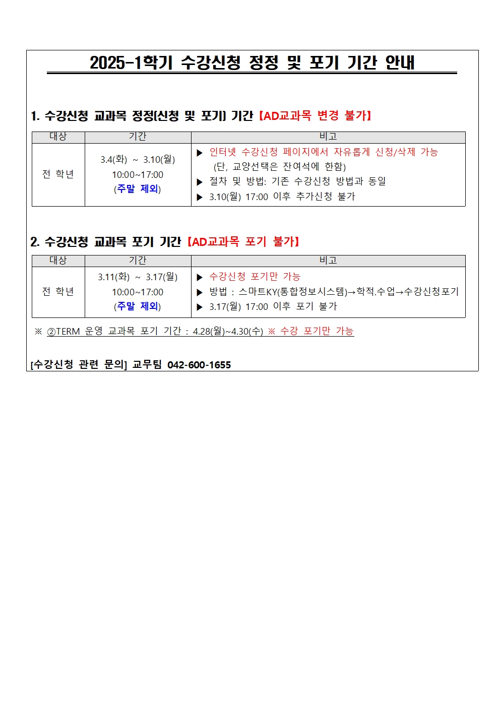| 제목 | 2025-1학기 수강신청 정정 및 포기기간 안내 | ||||