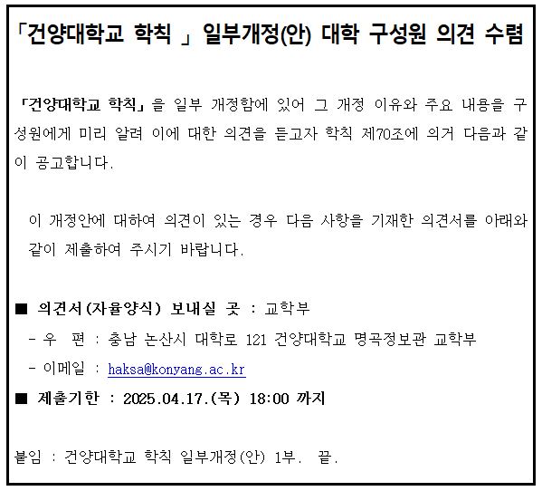 | 제목 | 「건양대학교 학칙 」개정(안) 대학 구성원 의견수렴 | ||||