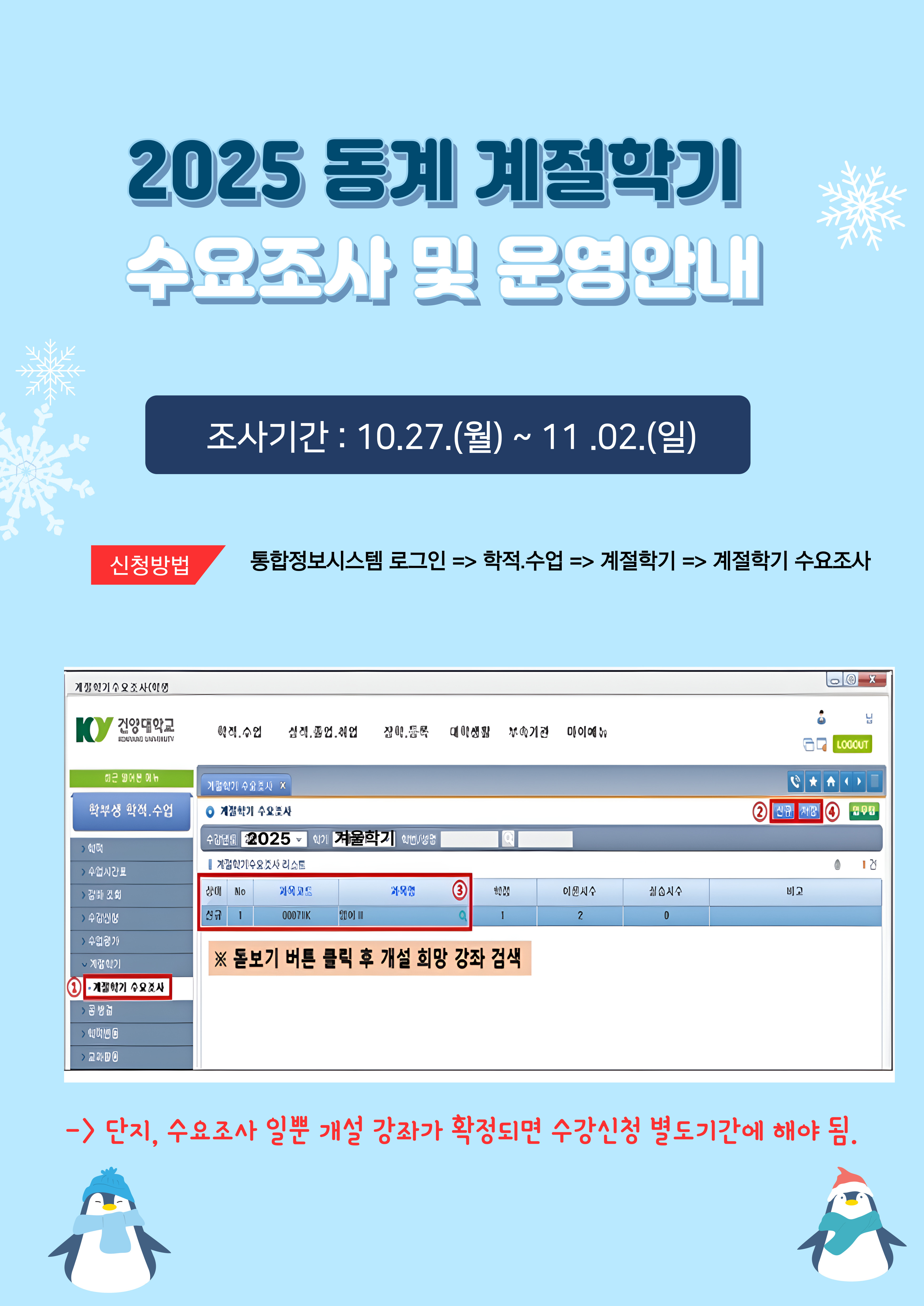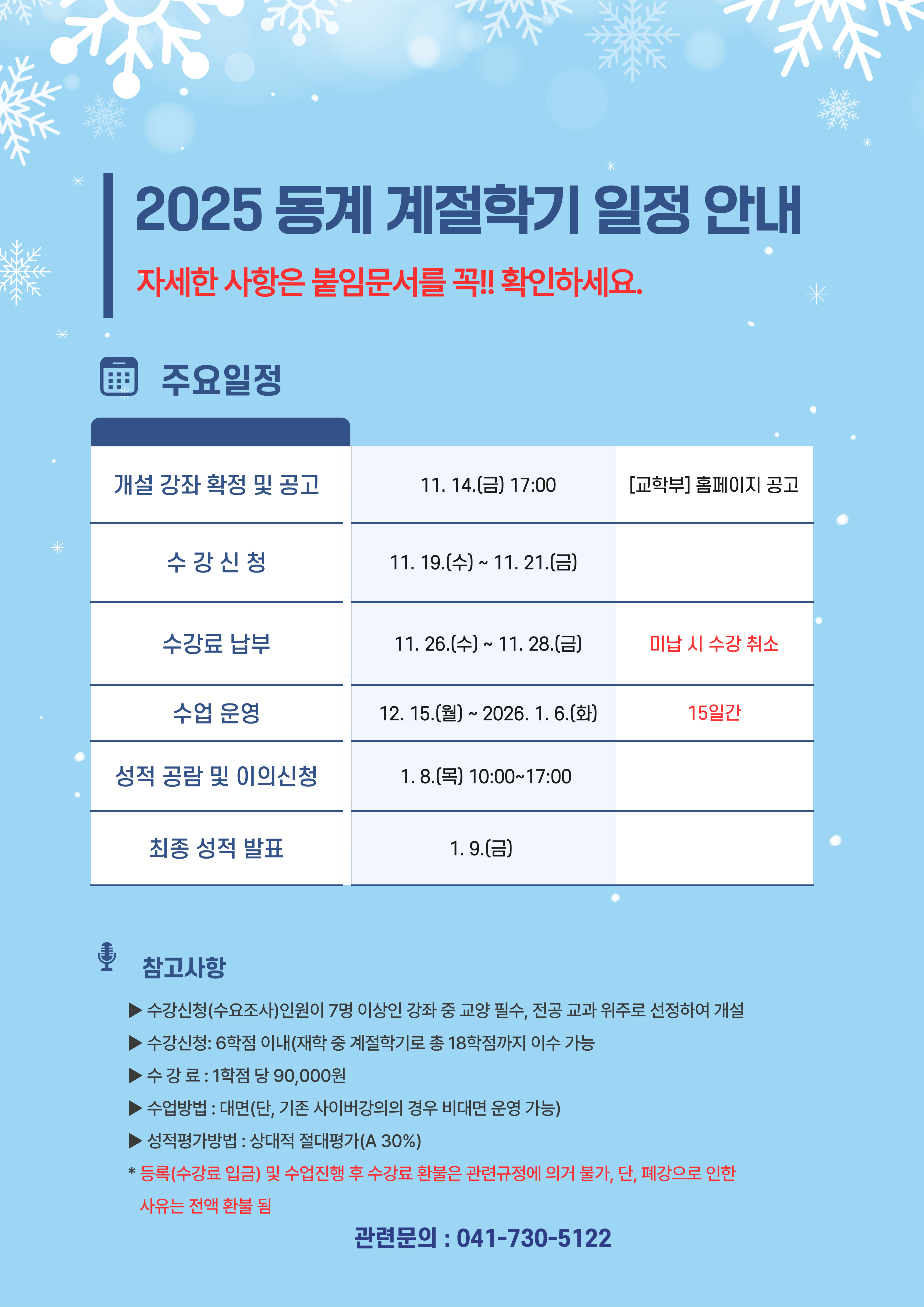 | 제목 | 2025학년도 동계 계절학기 수요조사 및 운영안내 | ||||