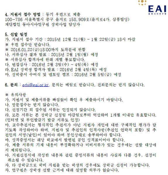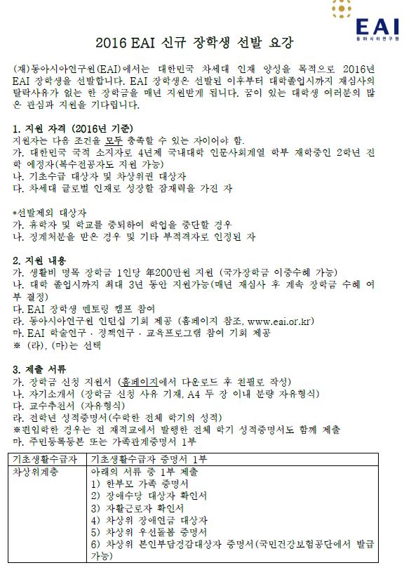 | 제목 | 2016 EAI (동아시아 연구원) 신규 장학생 선발(~28일까지 연장) | ||||