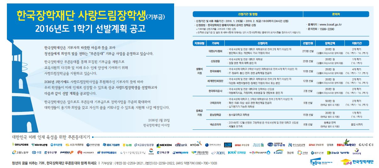 | 제목 | 2016학년도 1학기 사랑드림장학생 선발공고 | ||||