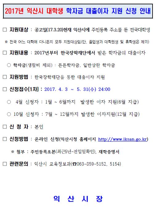 | 제목 | 2017년 익산시 대학생 학자금 대출이자 지원 신청 안내 | ||||