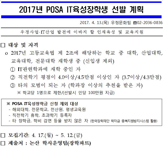 | 제목 | 2017년 POSA IT육성장학생 선발 계획 | ||||
