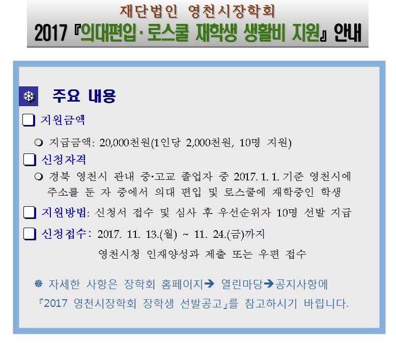 | 제목 | 2017학년도 (재)영천시장학회 의대편입/로스쿨재학생 생활비 지원 안내 | ||||