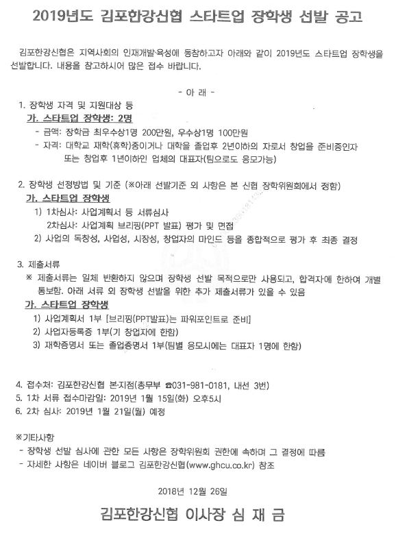 | 제목 | 2019학년도 김포한강신협 스타트업 장학생 선발 공고 | ||||