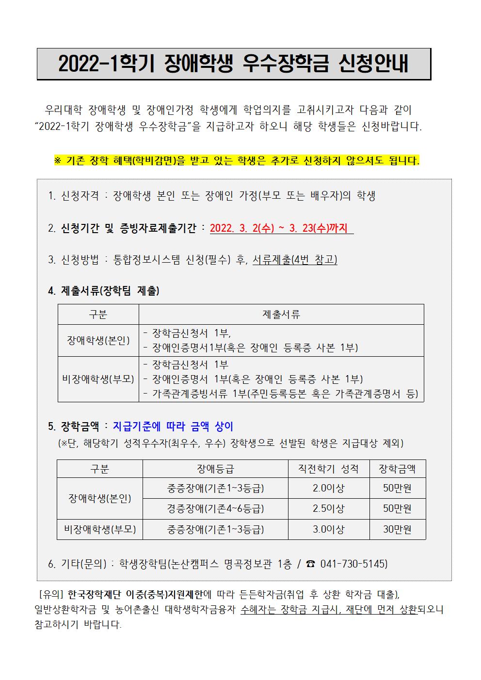 | 제목 | 2022-1학기 장애학생 우수장학금 신청 안내(신규자) | ||||