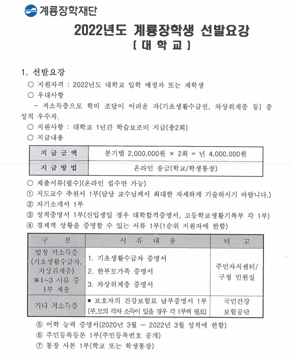 | 제목 | 2022년도 계룡장학재단 장학생 선발 안내 | ||||