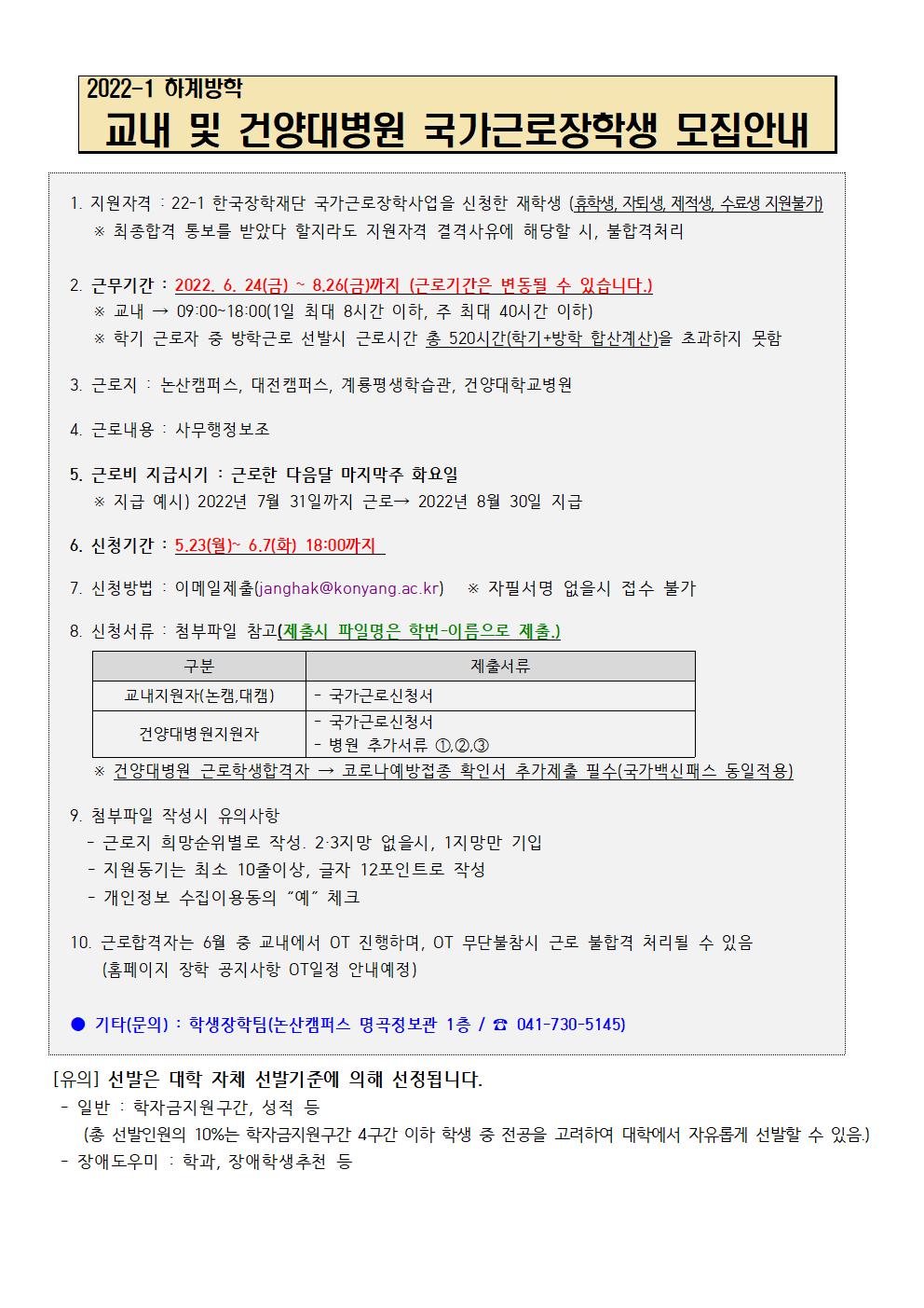 | 제목 | 2022학년도 1학기 하계방학 건양대병원 국가근로장학생 모집 안내 | ||||