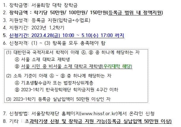 | 제목 | 2023년 서울희망 대학 장학생 모집 안내 | ||||