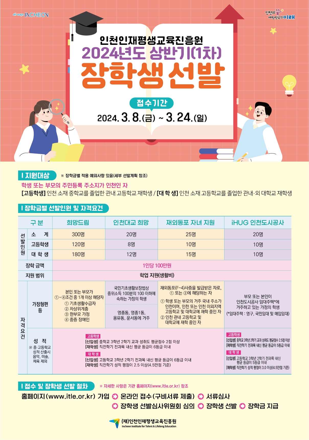 | 제목 | (재)인천인재평생교육진흥원 2024년도 상반기(1차) 장학생 선발 | ||||
