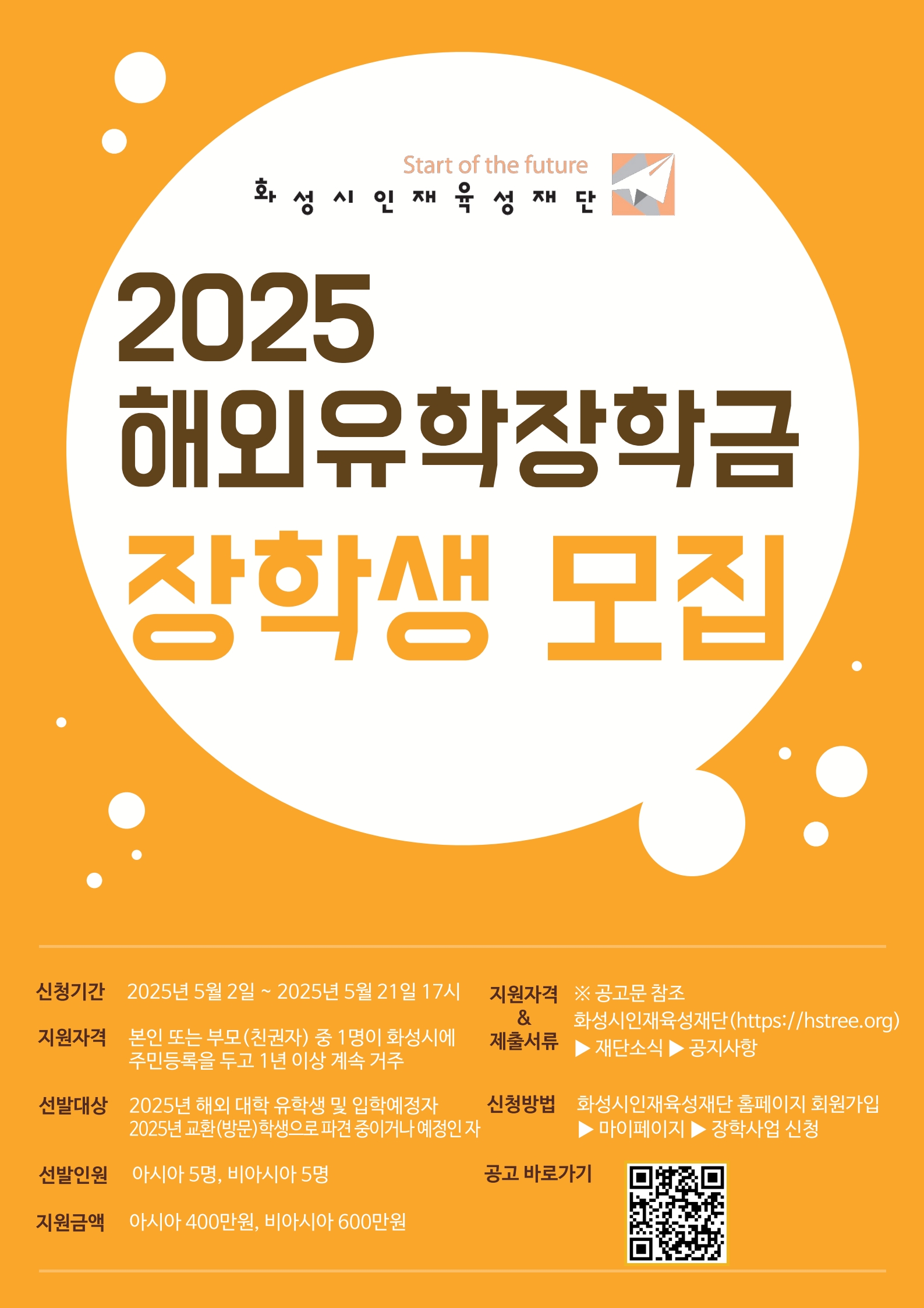 | 제목 | [화성시인재육성재단] 2025 해외유학장학금 장학생 모집 | ||||
