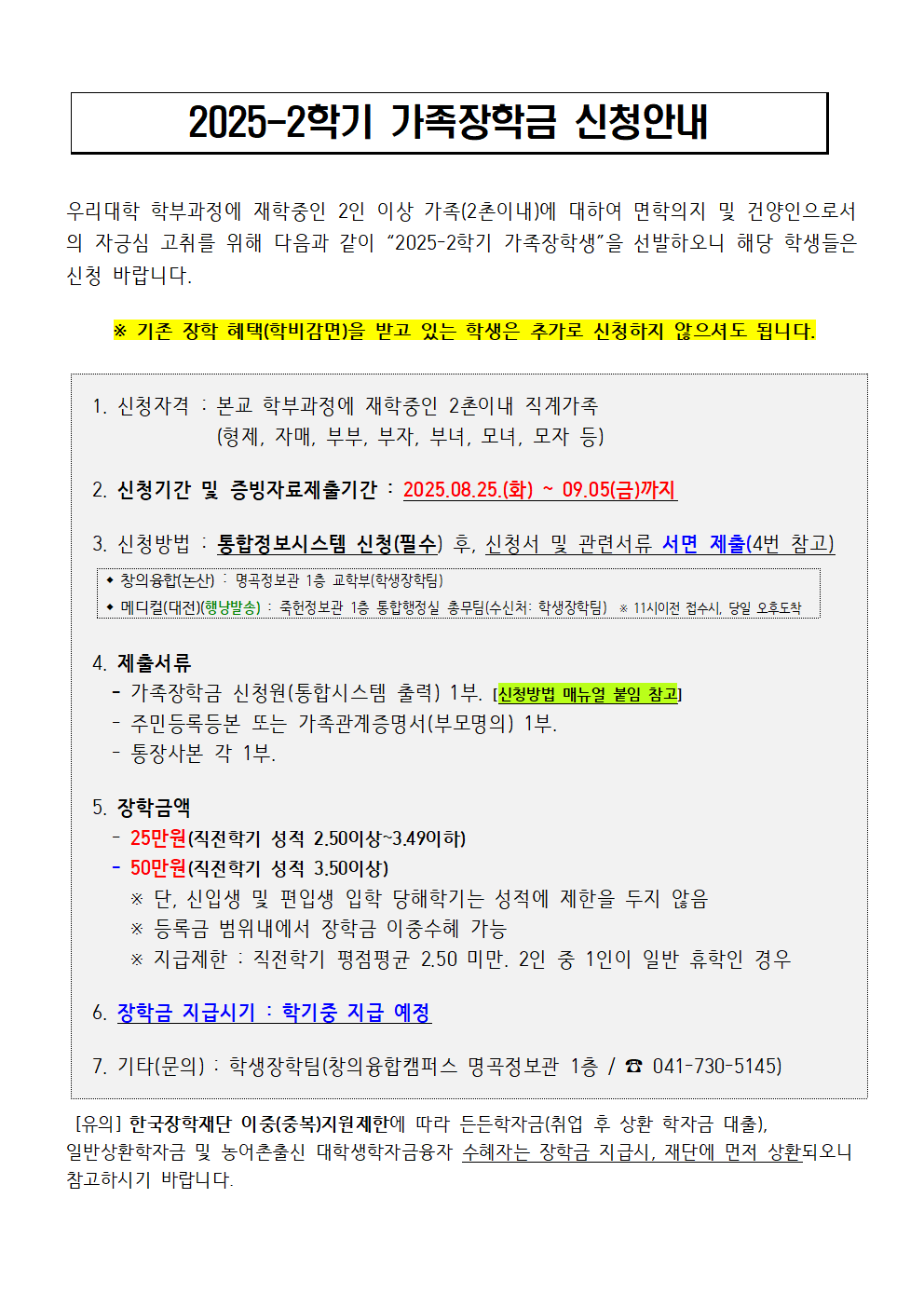 | 제목 | 2025-2학기 가족장학금(신규자) 모집안내 | ||||